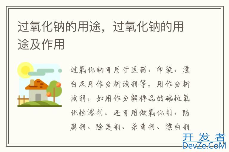 过氧化钠可用于医药、印染、漂白及用作分析试剂等。用作分析试剂,如用作分解样品的碱性氧化性溶剂。还可用做氧化剂、防腐剂、除臭剂、杀菌剂、漂白剂等。也可用于制备过氧化氢。用于漂白动植物纤维、羽毛、兽骨等,
