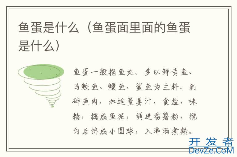 开发者_开发技巧 鱼蛋一般指鱼丸。多以鲜黄鱼、马鲛鱼、鳗鱼、鲨鱼为主料。剁碎鱼肉,加适量姜汁、食盐、味精,捣成鱼泥,调进番薯粉,搅匀后挤成小圆球,入沸汤煮熟。其色如瓷,富有弹性,脆而不腻,为
