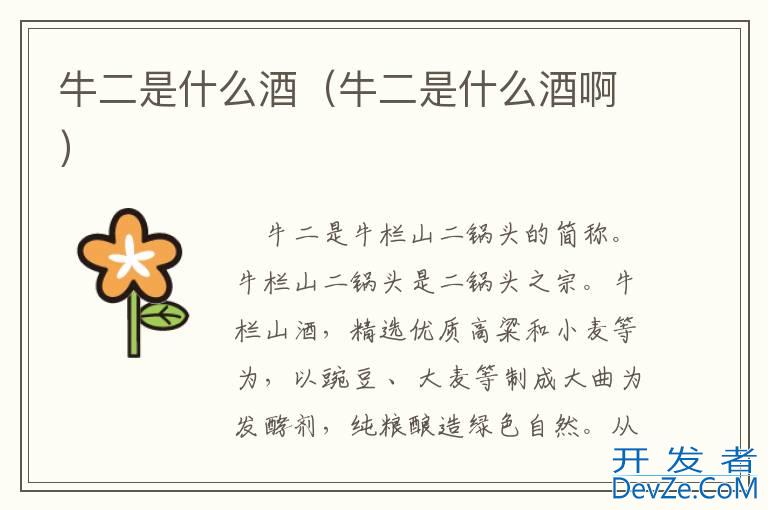 开发者_Python百科牛二是牛栏山二锅头的简称。牛栏山二锅头是二锅头之宗。牛栏山酒,精选优质高粱和小麦等为,以豌豆 、大麦等制成大曲为发酵剂,纯粮酿造绿色自然。从原料粉碎到成品酒灌装,历经糊化 、发