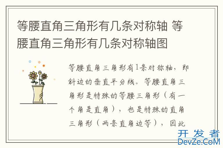 等腰直角三角形有1条对称轴,即斜边的垂直平分线。等腰直角三角形是特殊的等腰三角形(有一个角是直角),也是特殊的直角三角形(两条直角边等),因此等腰直角三角形具有等腰三角形和直角三角形的所有性质(如三线