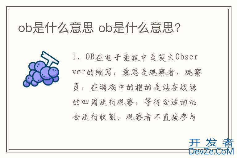 开发者_JAVA技巧 1、OB在电子竞技中是英文Observer的缩写,意思是观察者、观察员,在游戏中的指的是站在战场的四周进行观察,等待合适的机会进行收割。观察者不