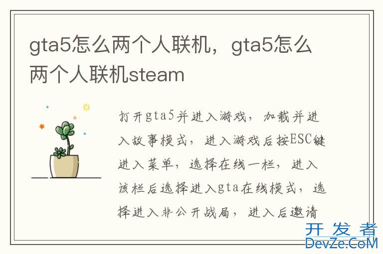 打开gta5并进入游戏,加载并进入故事模式,进入游戏后按ESC键进入菜单,选择在线开发者_C百科一栏,进入该栏后选择进入gta在线模式,选择进入非公开战局,进入后邀请需要联机的另一个人即可两人联机。《