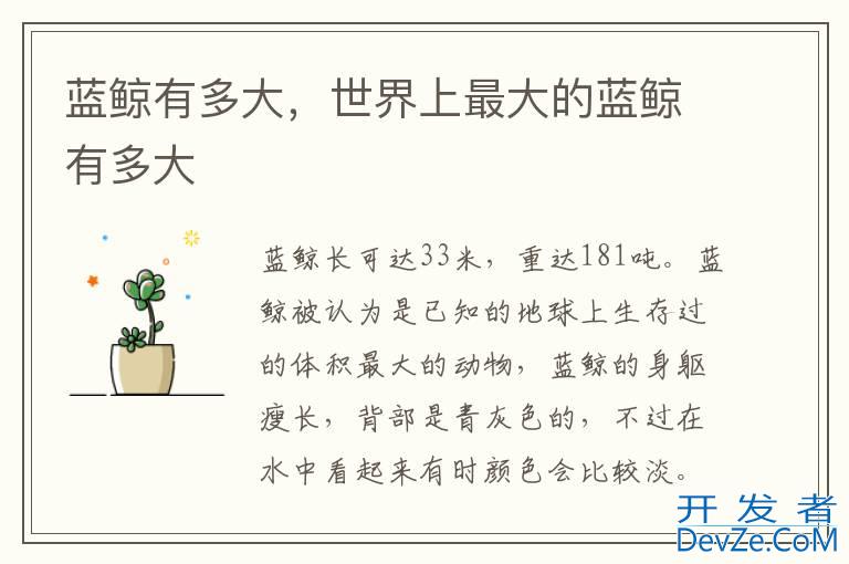 蓝鲸长可达33米,重达181吨。蓝鲸被认为是已知的地球上生存过的体积最大的动物,蓝鲸的身躯瘦长,背部是青灰色的,不过在水中看起来有时颜色会比较淡。蓝鲸的鳍肢长3-4米。上方为灰色,窄边白色。下方全白。