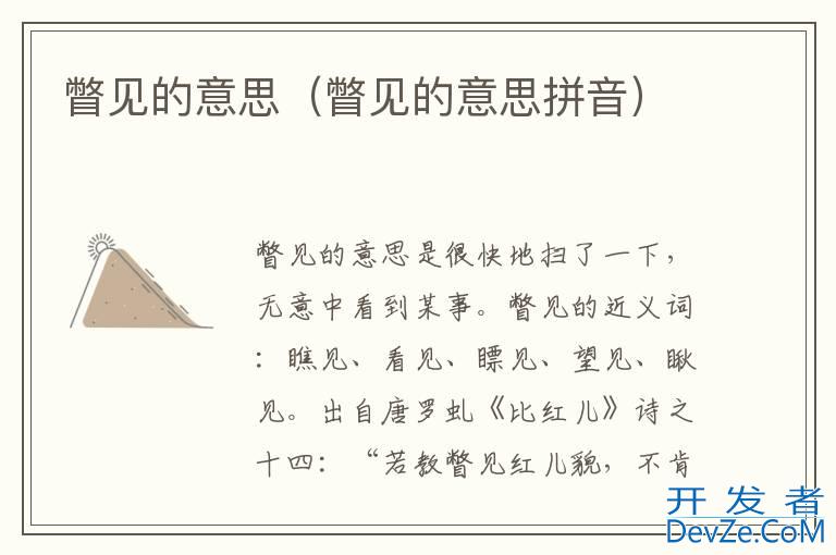瞥见的意思是很快地扫了一下,无意中看到某事。瞥见的近义词:瞧见、看见、瞟见、望见、瞅见。出自唐罗虬《比红儿》诗之十四:“若教瞥见红儿貌,不肯留情付洛神。”瞥见造句:1、我宁肯瞥见小伙子人酡颜,也不肯瞥