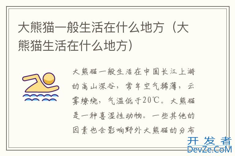 大熊猫一般生活在中国长江上游的高山深谷,常年空气稀薄,云雾缭绕,气温低于20℃。大熊猫是一种喜湿性动物。一些其他的因素也会影响野外大熊猫的分布和密度:竹子、地形、水源的分布,是否有藏身处和哺育幼仔的巢