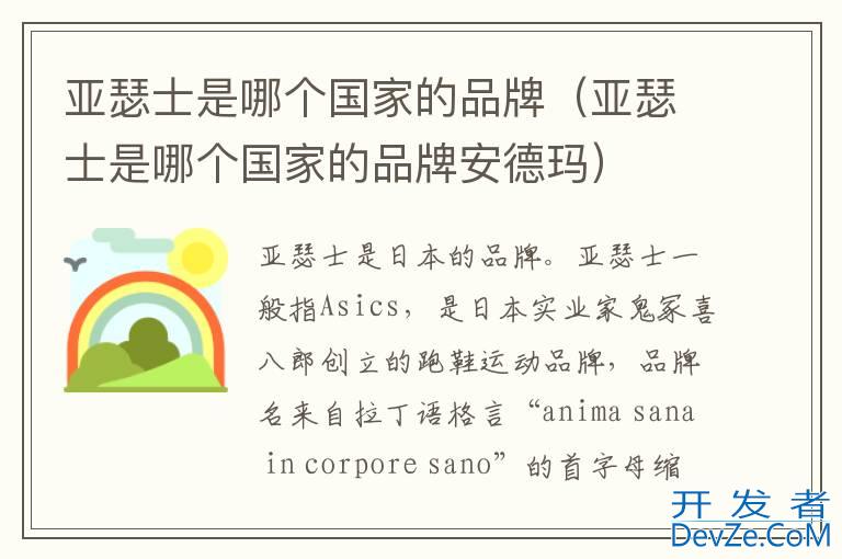 亚瑟士是日本的品牌。亚瑟士一般指Asics,是日本实业家鬼冢喜八郎创立的跑鞋运动品牌,品牌名来自拉丁语格言“anima sana in corpore sano”的首字母缩写, 意为“健全的精神寓于强