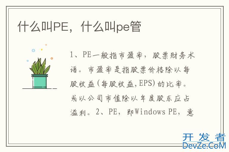 1、PE一般指市盈率,股票财务术语。市盈率是指股票价格除以每股开发者_运维知识库收益(每股收益,EPS)的比率。或以公司市值除以年度股东应占溢利。市盈率是最常用来评估股价水平是否合理的指标之一,是很具