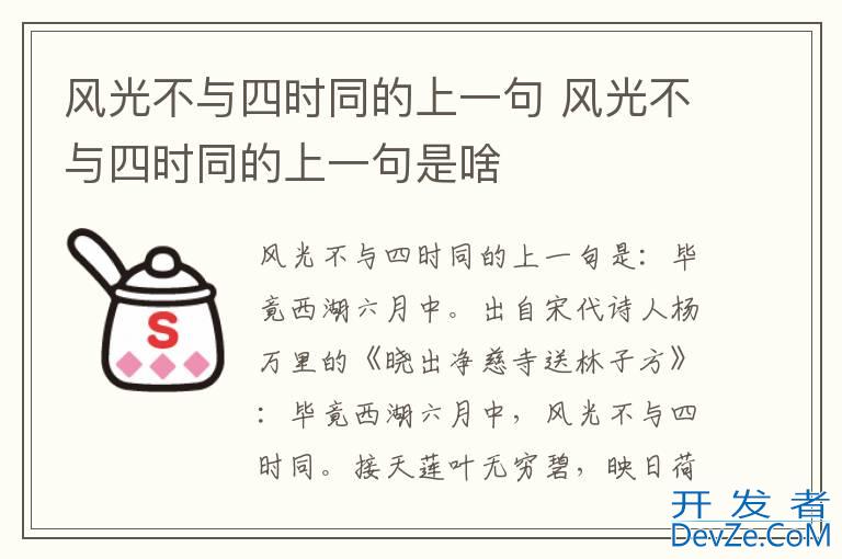 风光不与四时同的上一句是:毕竟西湖六月中。出自宋代诗人杨万里的《晓出净慈寺送林子方》:毕竟西湖六月中,风光不与四时同。接天莲叶无穷碧,映日荷花别样红。翻译:六月里西湖的风光景色到底和其他时节的不一样,
