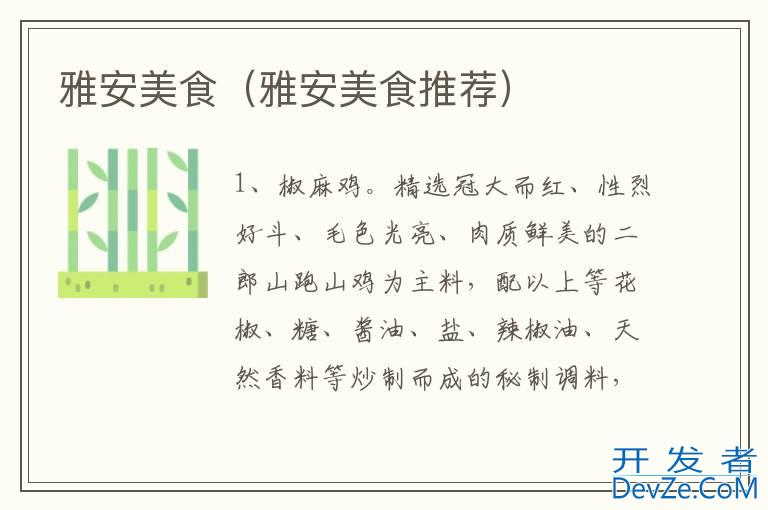 1、椒麻鸡。精选冠大而红、性烈好斗、毛色光亮、肉质鲜美的二郎山跑山鸡为主料,配以上等花椒、糖、酱油、盐、辣椒油、天然香料等炒制而成的秘制调料,具有肉质鲜美、皮薄脆嫩,麻辣鲜香、滋味甘甜、蛋白质含量高等