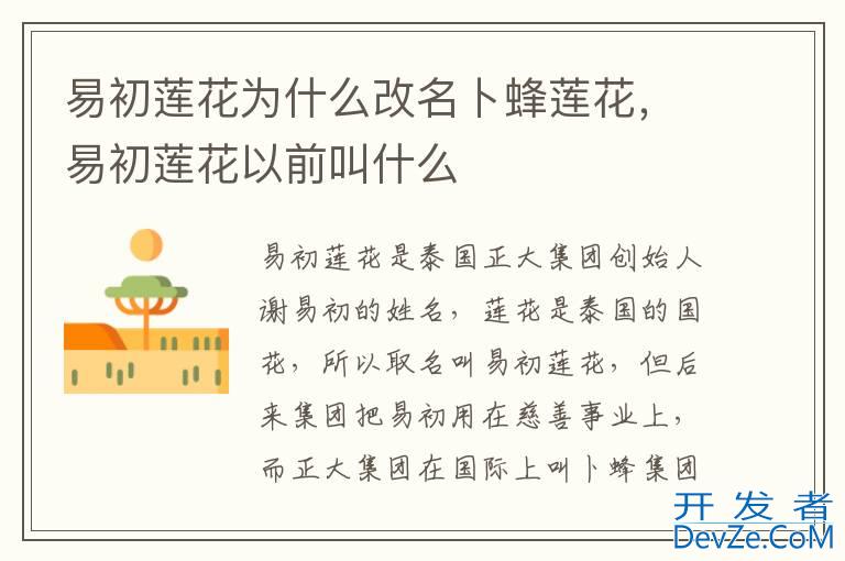 易初莲花是泰国正大集团创始人谢易初的姓名,莲花是泰国的国花,所以取名叫易初莲花,但后来集团把易初用在慈善事业上,而正大集团在国际上叫卜蜂集团,所以易初莲花改名卜蜂莲花。卜蜂莲花的目标是成为人们所喜爱的