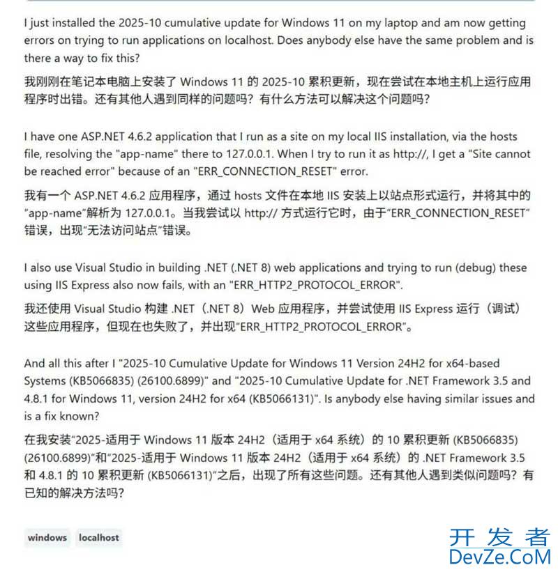 科技媒体 bleepingcomputer 10 月 16 日发布博文,报道称微软 Windows 11 系统的 9 月可选更新和 10 月累积更新存在 BUG,导致开发者和部分应用程序无法通过 HTTP / 2 协议连接至本地主机(localhost)。
