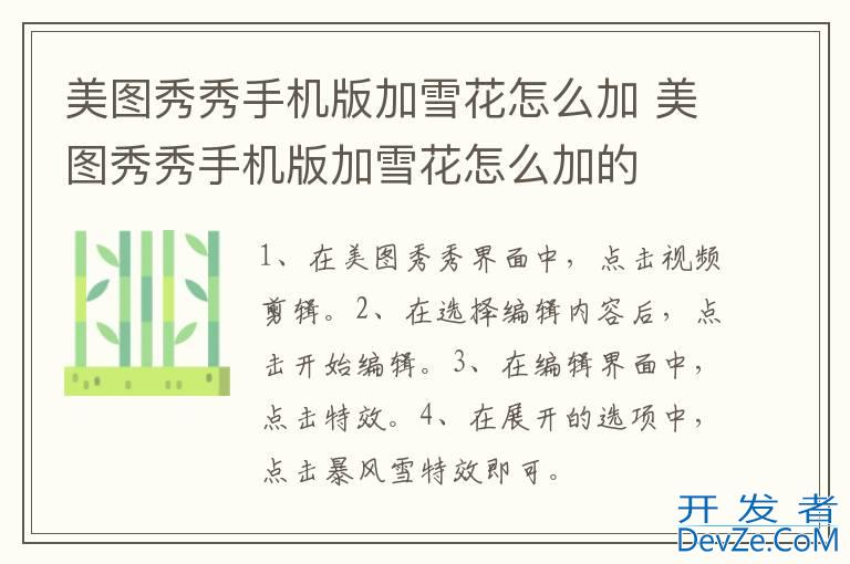 品牌型号:华为p50 系统:HarmonyOS 2.0.0 软件版本:美图秀秀 9.3.3.5美图秀秀手机版加雪花需要在视频剪辑中,选择暴风雪特效进行添加即可。以手机华为p50为例,美图秀秀手机版加雪