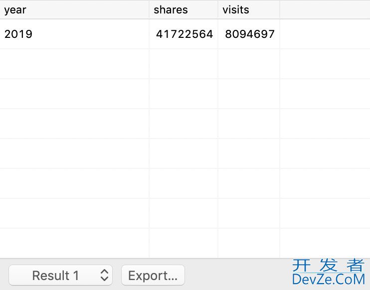 按www.devze.com年查询 select to_char(date::DATE, \'YYYY\') as year,sum(shares) as shares, sum(visits) as visits