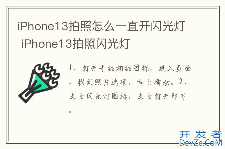 品牌型号:iPhone13 pro 系统:IOS15.4以iPhone13 pro为例,iPhone13拍照一直开闪光灯可以进入相机进行打开。分为2步,具体步骤如下:1进入相机图标向上滑动打开手机相机