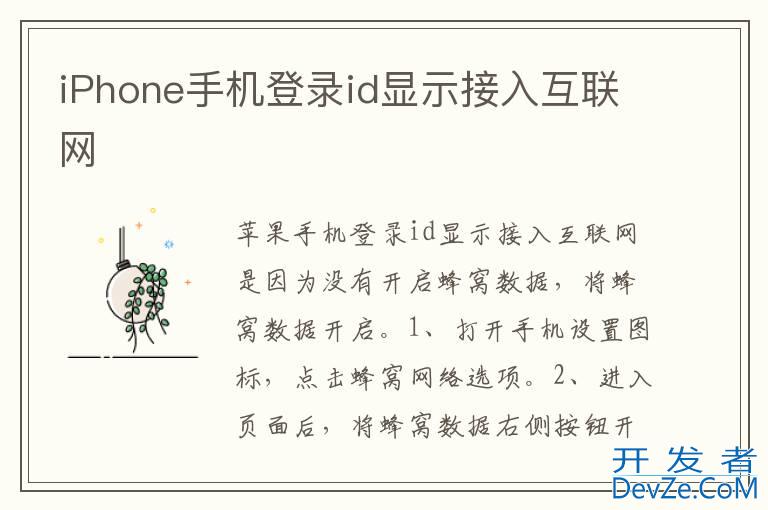 品牌型号:iPhone13 pro 系统:IOS15.4以iPhone13 pro为例,iPhone手机登录id显示接入互联网是因为没有开启蜂窝数据,将蜂窝数据开启。分为2步,具体步骤如下:1进入设置