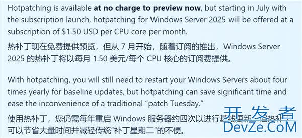 科技媒体 borncity 今天(4 月 29 日)发布博文,报道称微软宣布将于 2025 年 7 月 1 日开始,Windows Server 2025 的热补丁(Hotpatching)功能转为订阅制收费,每月每 CPU 核心收费 1.50 美元(现汇率约合 10.9 元