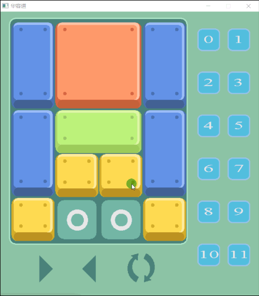 目录程序简介程序执行效果完整源代码程序简介 华容道,画风参考的是手机程序:超级华容道。玩法是将大块移动至下层的中间。随机盘面,难度适中,自动解题。