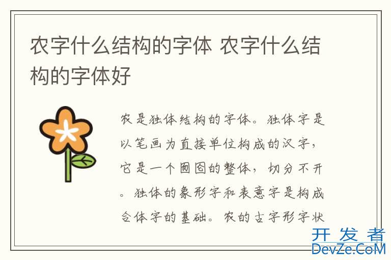 开发者_JAVA技巧 农是独体结构的字体。独体字是以笔画为直接单位构成的汉字,它是一个囫囵的整体,切分不开。独体的象形字和表意字是构成合体字的基础。农的古字形字状似一个人手持工具在山林草