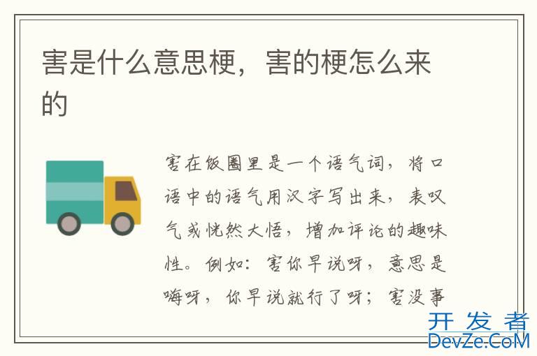 开发者_如何学C害在饭圈里是一个语气词,将口语中的语气用汉字写出来,表叹气或恍然大悟,增加评论的趣味性。例如:害你早说呀,意思是嗨呀,你早说就行了呀;害没事,意思是哎,没事。害来源于饭圈,一般在评论调
