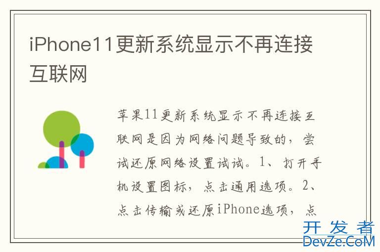 品牌型号:iPhone11 pro 系统:IOS15.4以iPhone11 pro为例,iPhone11更新系统显示不再连接互联网是因为网络问题导致的,尝试还原网络设置试试。分为3步,具体步骤如下:1