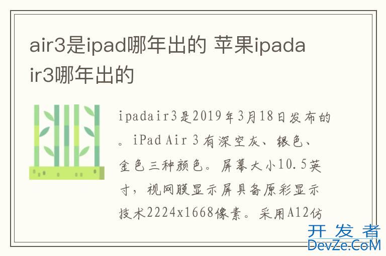 品牌型号:iPad air Air 3 系统:iPad airOS 15.4iPad air Air 3是201开发者_如何转开发9年3月18日发布的。iPad air Air 3 有深空灰、银色、金