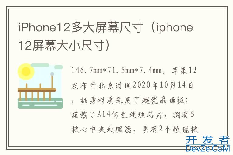 品牌型号:iPhone12 pro 系统:iOS14iPhone12的屏幕尺寸为146.7mm*71.5mm*7.4mm。iPhone12发布于北京时间2020年10月14日,机身材质采用了超瓷晶面板
