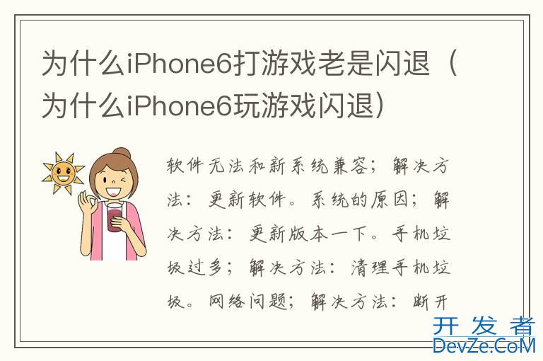 品牌型号:iPhone6 系统:iOS9开发者_C百科 iPhone6打游戏老是闪退的原因:1、软件无法和新系统兼容;解决方法:用户只需在应用商店更新软件即可。2、手机垃圾过多导致打游